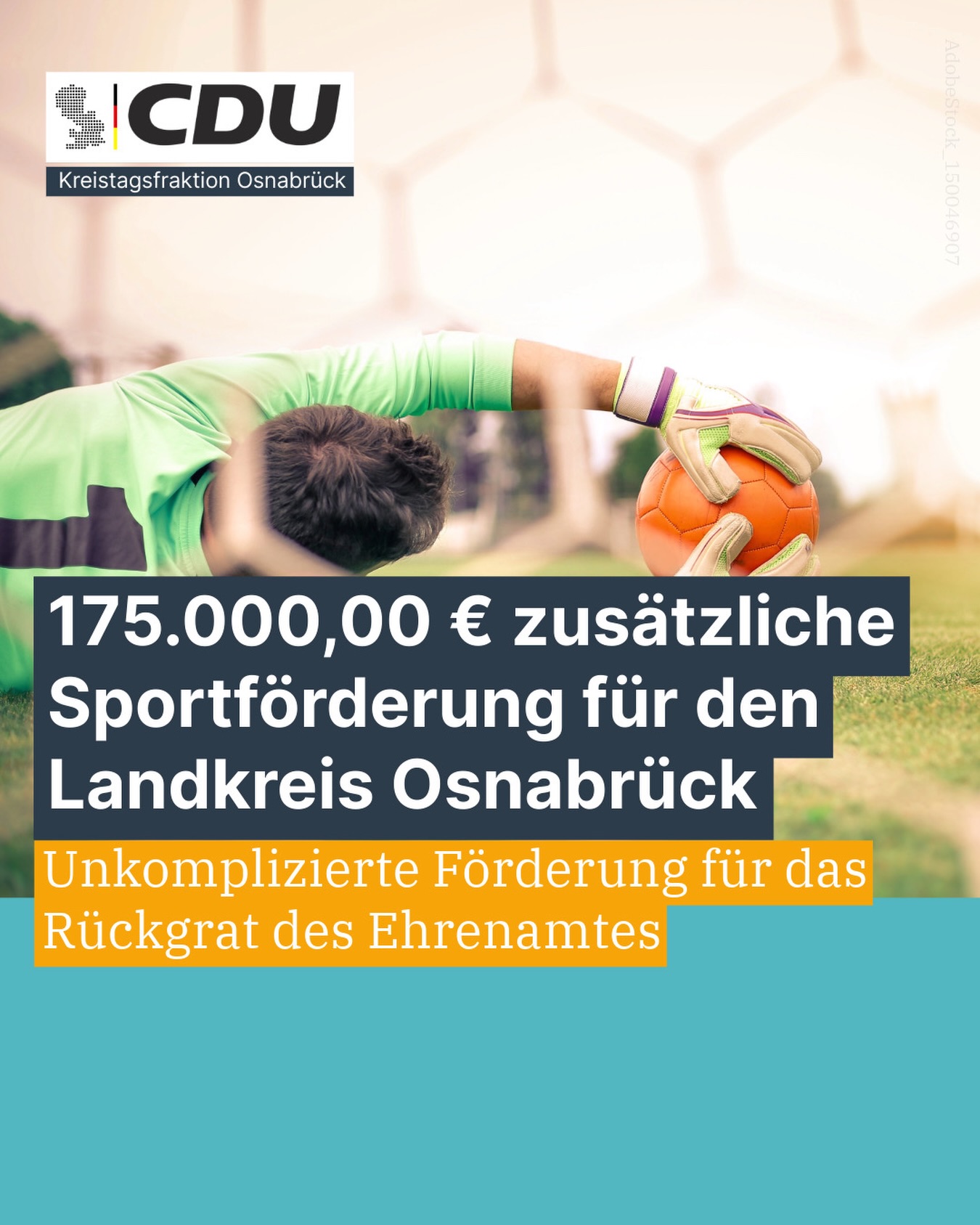 mehr💪 175.000 ? zusätzliche Sportförderung für den Landkreis Osnabrück ? unkompliziert, fair und direkt für das Ehrenamt! Die CDU-Kreistagsfraktion setzt sich dafür ein, dass alle Sportvereine 2026 eine pauschale Förderung von 1,50 ? pro Mitglied erhalten. Maßgeblich ist die Mitgliederzahl zum 01.01.2026. Hierfür sollen insgesamt 175.000 ? im Kreishaushalt bereitgestellt werden. "Unsere Sportvereine sind das Rückgrat des Ehrenamtes im Landkreis. Mit unserem Vorschlag stärken wir sie direkt, fair und vor allem unbürokratisch", erklärt Christoph Ruthemeyer. "Das ist eine Investition in den gesellschaftlichen Zusammenhalt und in unsere Dorfgemeinschaften. Rund jeder dritte Einwohner im Landkreis profitiert davon, weil er Mitglied in einem Sportverein ist", so Ruthemeyer weiter. "Über die Förderung des Ehrenamtes wird viel gesprochen. Mit 1,50 ? pro Mitglied kommt die Unterstützung genau dort an, wo sie wirkt: bei den Vereinen, ihren Jugendlichen und den Ehrenamtlichen vor Ort", betont Andreas Quebbemann. "Wir vertrauen bewusst den Vereinsvorständen und verzichten auf zusätzliche Verwendungsnachweise, die nur Bürokratie und zusätzliche Kosten verursachen würden." Die pauschale Förderung schafft finanzielle Spielräume für Nachwuchsprogramme, Sportgeräte oder stabile Mitgliedsbeiträge. "Gerade in Zeiten steigender Kosten brauchen unsere Vereine schnelle und verlässliche Unterstützung ? ohne bürokratische Hürden", so Quebbemann abschließend. Unser Ansatz ist klar: unkompliziert helfen statt verwalten! #sport #2026 #osnabrück #förderung #ehrenamt