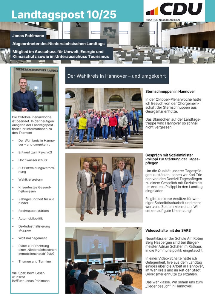 mehrDie Oktober-Plenarwoche ist beendet. In der heutigen Ausgabe der Landtagspost findet ihr Informationen zu den Themen:- Der Wahlkreis in Hannover ? und umgekehrt- Entwurf zum PsychKG- Hochwasserschutz- EU-Entwaldungsverordnung- Wahlkreisreform- Krisenfestes Gesundheitswesen- Zahngesundheit für alle Kinder- Rechtsstaat stärken- Automobilpolitik- De-Industrialisierung stoppen- Wolfsmanagement- Pläne zur Errichtung einer ?Niedersächsischen Immobilienanstalt? (NIA)- Themen und TermineViel Spaß beim Lesen wünscht Ihr/Euer Jonas PohlmannDownload Landtagspost: https://www.jonas-pohlmann.de/download?dokument=1&file=44#badiburg #badlaer #wk76 #füreuchvorortundimlandtag #hagenatw #cdu #georgsmarienhütte #badrothenfelde #glandorf #hasbergen #niedersachsen #mitvereintenkräften #machen #landkreisosnabrück #osnabrückerland #landtag #pohlmann #jonaspohlmann #Fördermittel #Zahngesundheit #Landwirtschaft #Naturschutz #wolf #wahlkreisreform #Gesundheitswesen #Hochwasserschutz